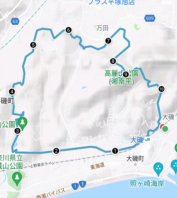 大磯駅から東へ少し歩いた、神明町公園発着のぐるっと1周13kmで、神明町公園→大磯運動公園→コマツ製作所前→湘南平展望台→楊谷→寺谷戸横穴墓群→神明町公園